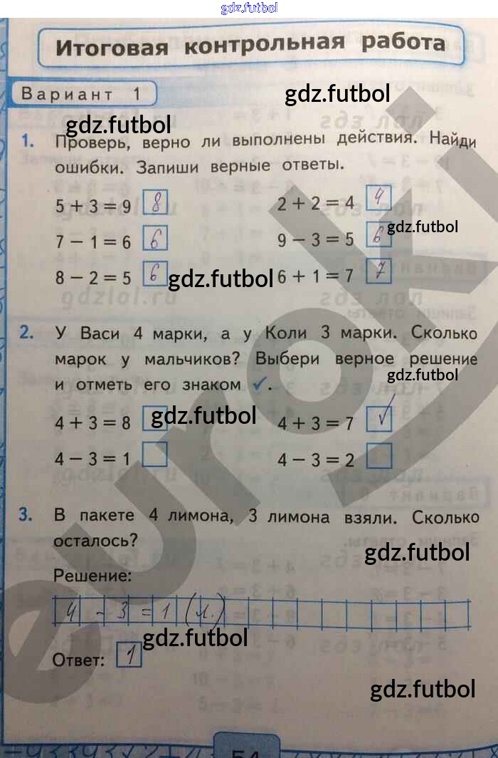 Готовые домашние задания по Математике за 1 класс Рудницкая Контрольные работы УМК 2014 ФГОС - Часть 1. Страницы 54