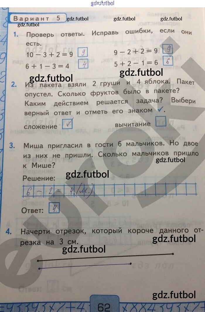 Готовые домашние задания по Математике за 1 класс Рудницкая Контрольные работы УМК 2014 ФГОС - Часть 1. Страницы 62