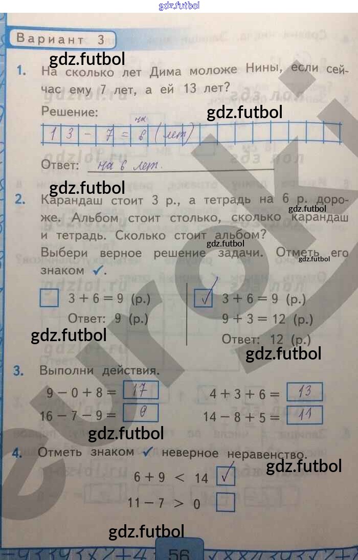 Готовые домашние задания по Математике за 1 класс Рудницкая Контрольные работы УМК 2014 ФГОС - Часть 2. Страницы 56