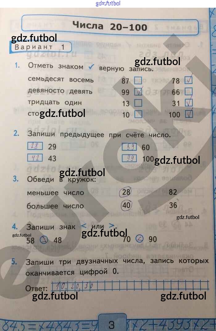 Готовые домашние задания по Математике за 2 класс Рудницкая Контрольные работы УМК 2017 ФГОС - Числа 20—100 Вар-1
