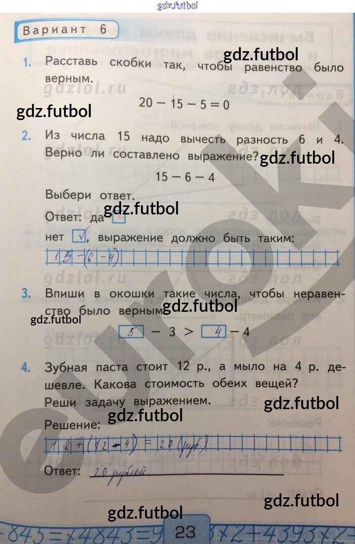 Готовые домашние задания по Математике за 2 класс Рудницкая Контрольные работы УМК 2017 ФГОС - Числовые выражения и их значения Вар-6