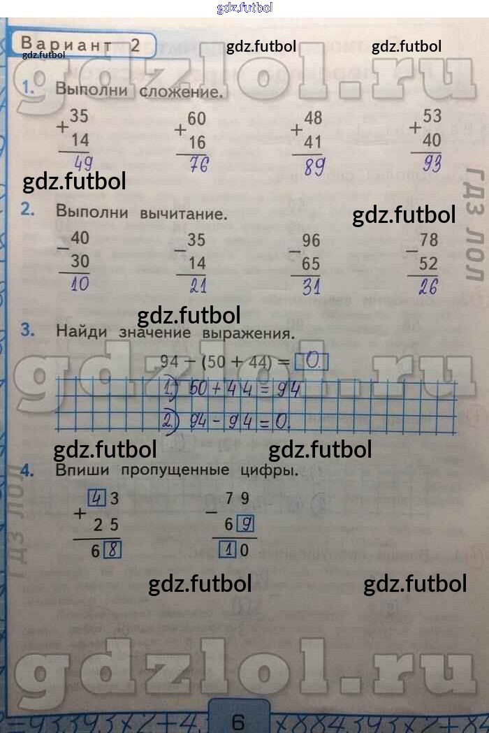 Готовые домашние задания по Математике за 2 класс Рудницкая Контрольные работы УМК 2017 ФГОС - Сложение и вычитание без перехода через десяток Вар-2