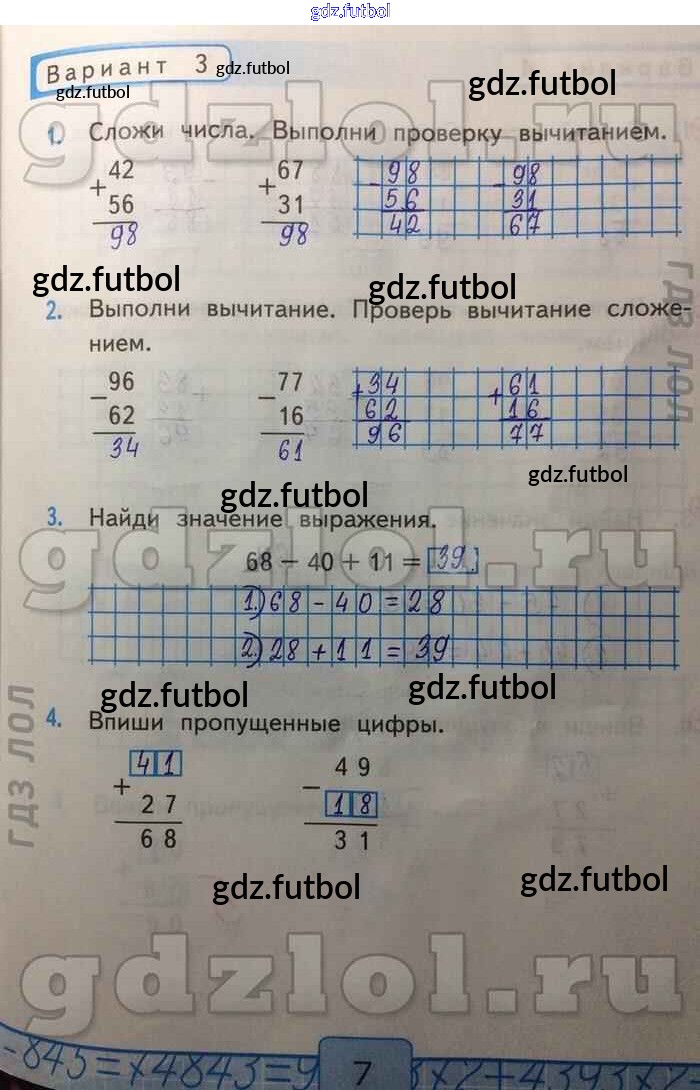 Готовые домашние задания по Математике за 2 класс Рудницкая Контрольные работы УМК 2017 ФГОС - Сложение и вычитание без перехода через десяток Вар-3