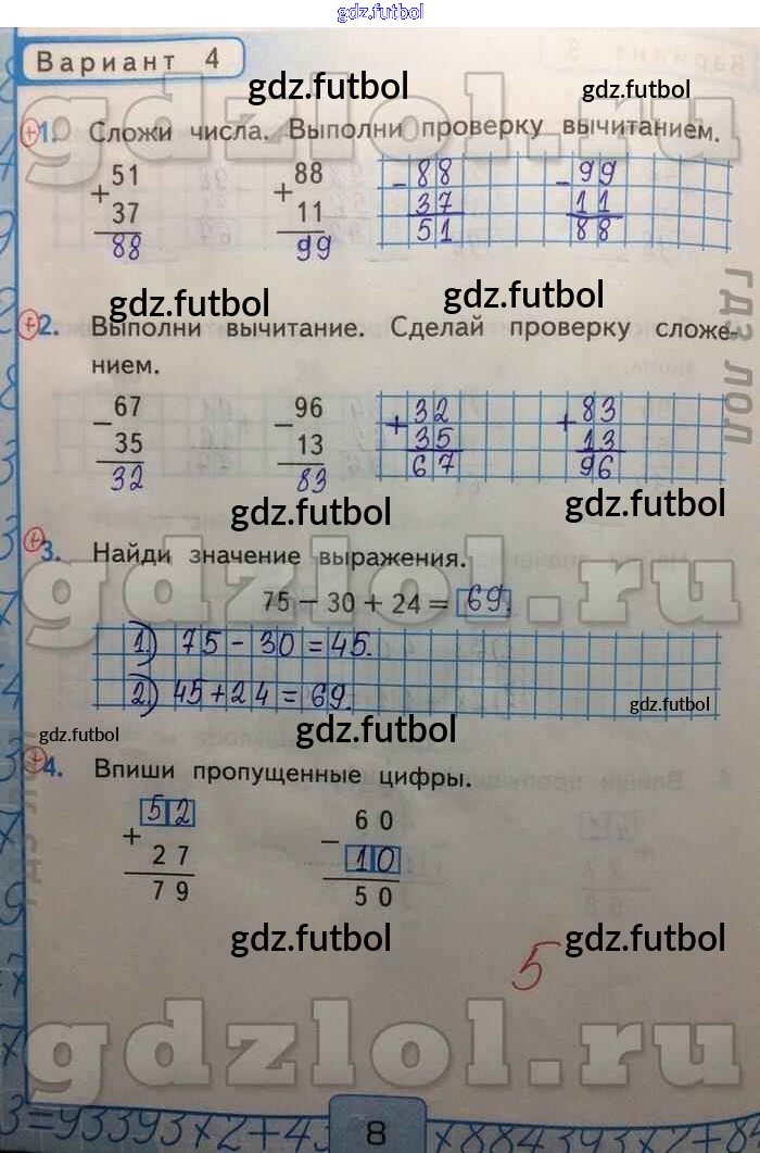 Готовые домашние задания по Математике за 2 класс Рудницкая Контрольные работы УМК 2017 ФГОС - Сложение и вычитание без перехода через десяток Вар-4