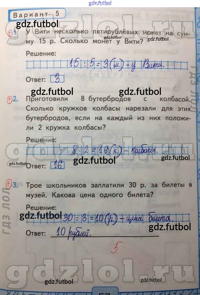 Готовые домашние задания по Математике за 2 класс Рудницкая Контрольные работы УМК 2017 ФГОС - Решение задач на умножение и деление Вар-5