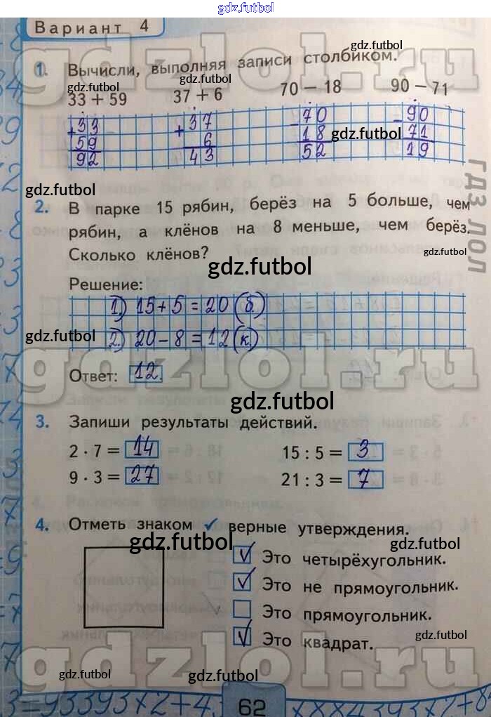 Готовые домашние задания по Математике за 2 класс Рудницкая Контрольные работы УМК 2017 ФГОС - Итоговая контрольная работа Вар-4