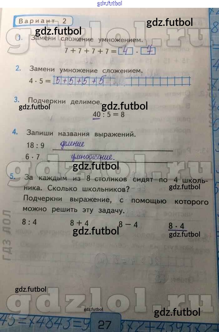 Готовые домашние задания по Математике за 2 класс Рудницкая Контрольные работы УМК 2017 ФГОС - Умножение и деление Вар-2