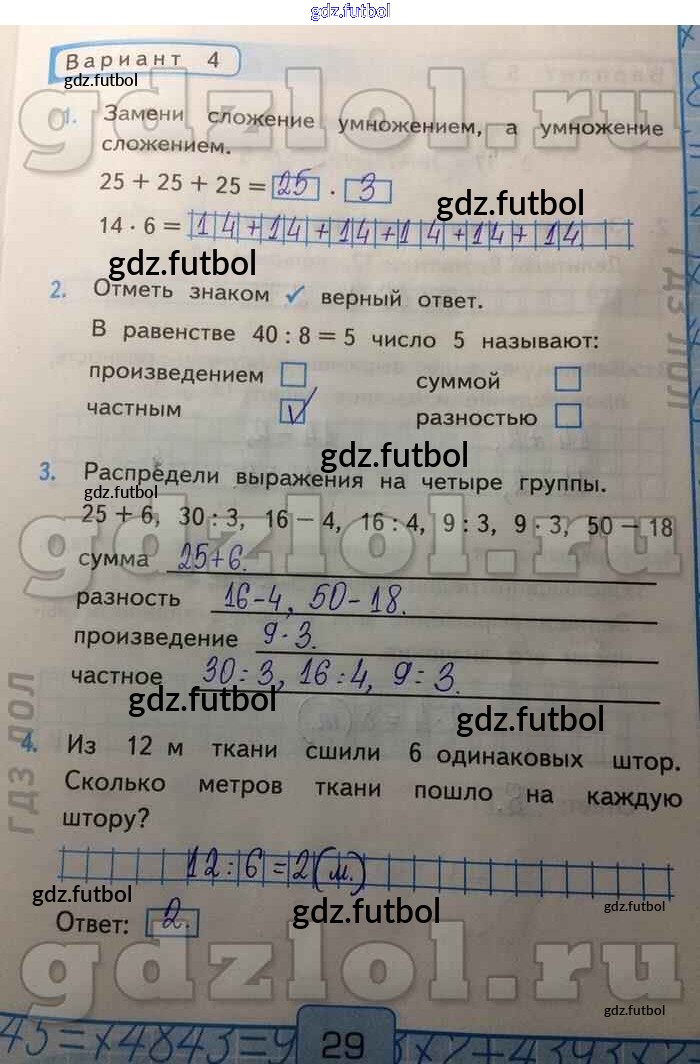 Готовые домашние задания по Математике за 2 класс Рудницкая Контрольные работы УМК 2017 ФГОС - Умножение и деление Вар-4