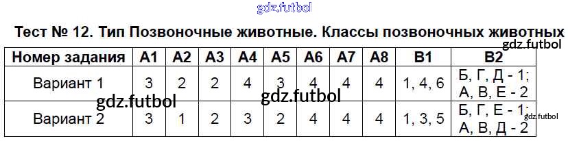 Готовые домашние задания по Биологии за 5 класс Богданов Контрольно-измерительные материалы (КИМ) 2017 ФГОС - Тесты Тест №12. Тип Позвоночные животные. Классы позвоночных животных