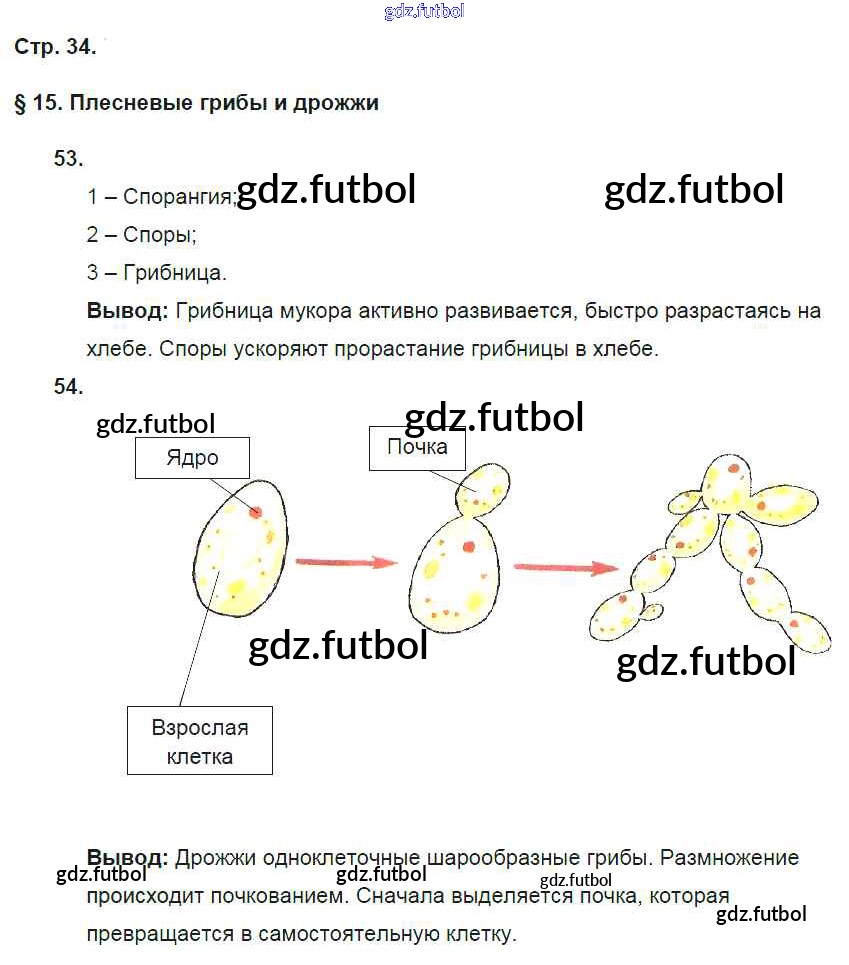 Готовые домашние задания по Биологии за 5 класс Пасечник Рабочая тетрадь Вертикаль 2015 ФГОС - § 15. Плесневые грибы и дрожжи стр. 34
