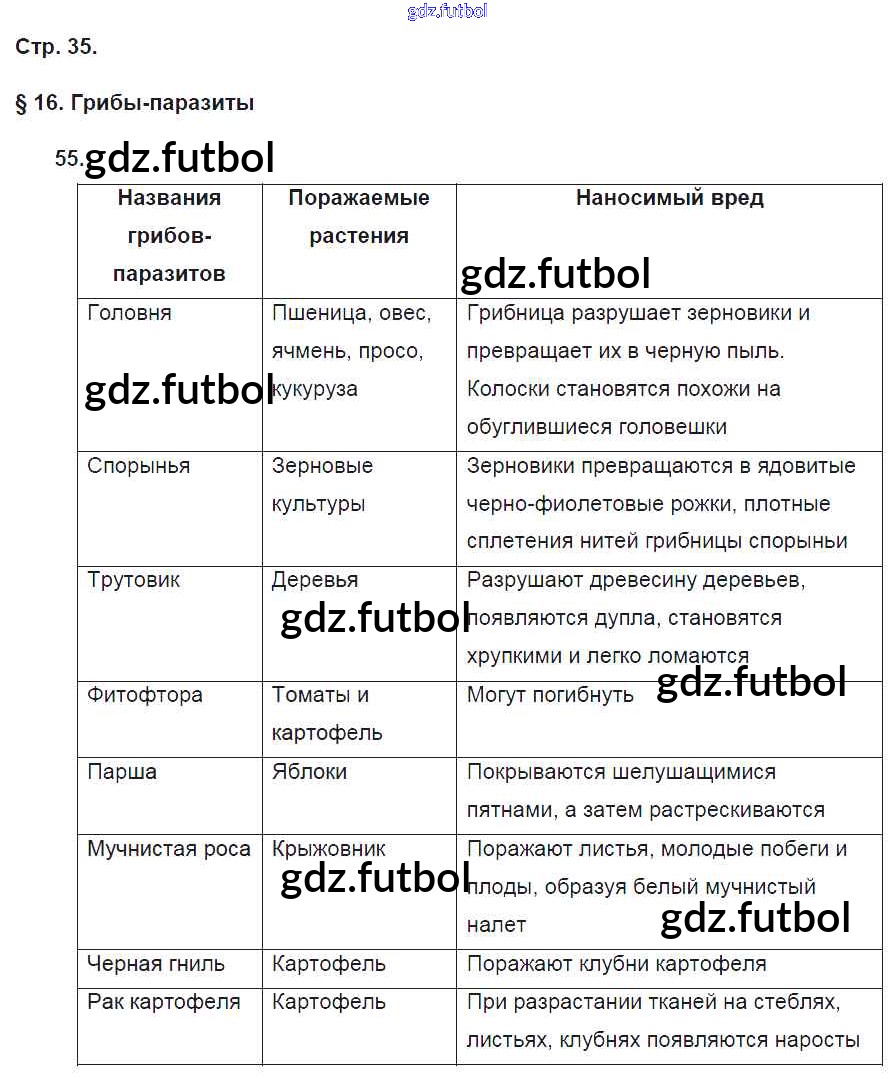 Готовые домашние задания по Биологии за 5 класс Пасечник Рабочая тетрадь Вертикаль 2015 ФГОС - § 16. Грибы-паразиты стр. 35