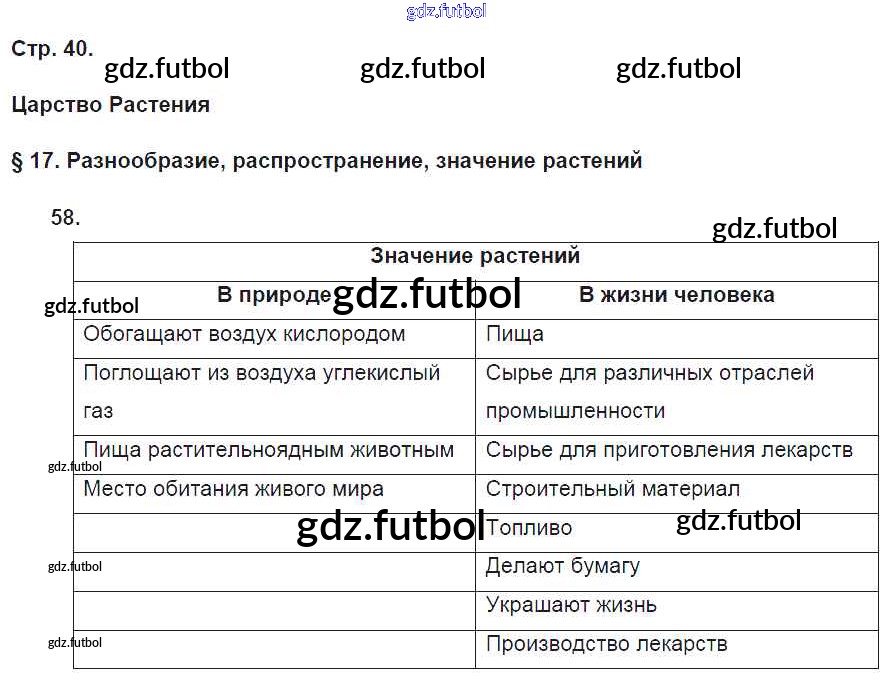 Готовые домашние задания по Биологии за 5 класс Пасечник Рабочая тетрадь Вертикаль 2015 ФГОС - § 17. Разнообразие, распространение, значение растений стр. 40