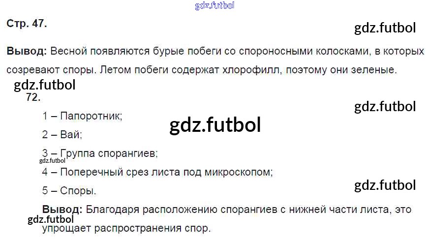 Готовые домашние задания по Биологии за 5 класс Пасечник Рабочая тетрадь Вертикаль 2015 ФГОС - § 21. Плауны. Хвощи. Папоротники стр. 47