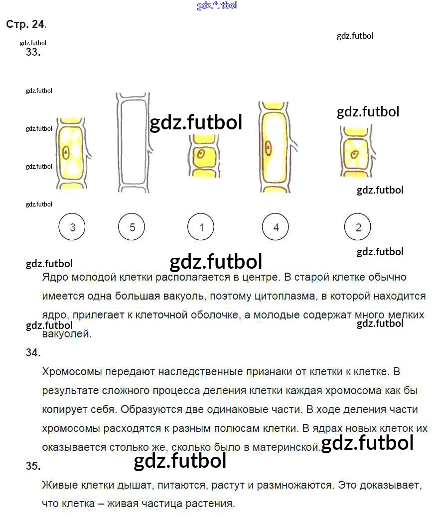 Готовые домашние задания по Биологии за 5 класс Пасечник Рабочая тетрадь Вертикаль 2015 ФГОС - § 9. Жизнедеятельность клетки, её деление и рост стр. 24