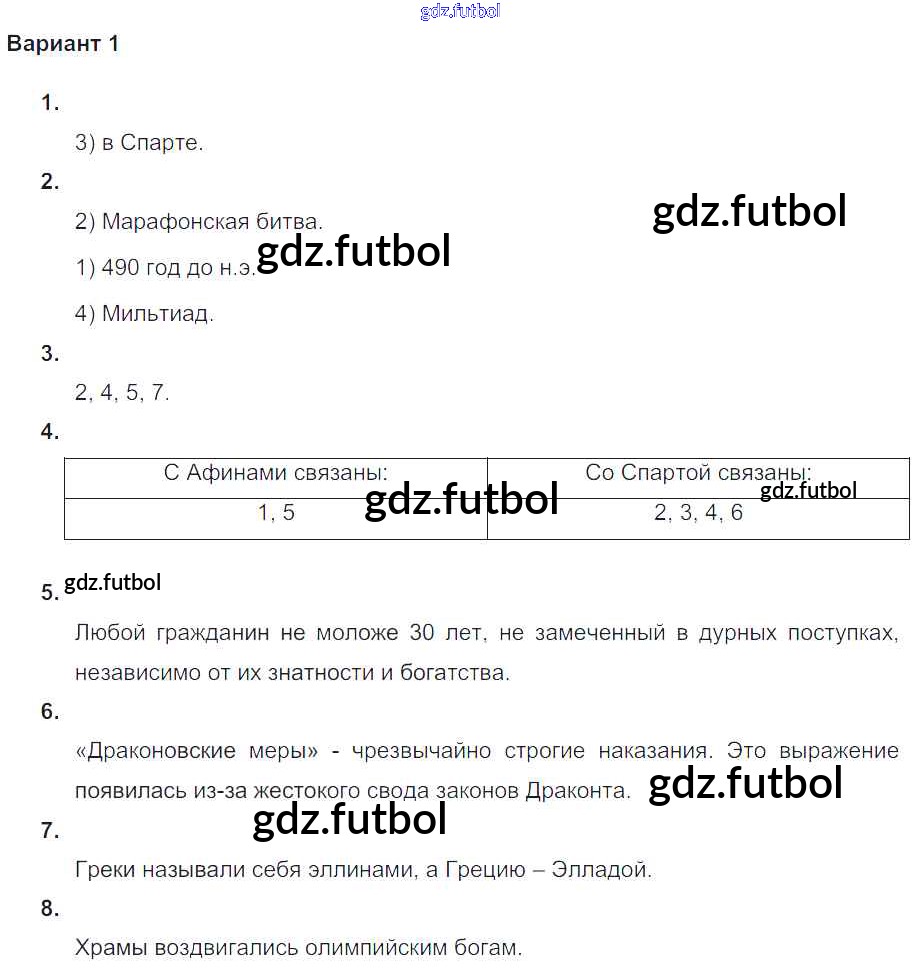 Готовые домашние задания по Истории за 5 класс Крючкова Проверочные и контрольные работы 2015 ФГОС - Итоговая контрольная работа к главе Полисы Греции и их борьба с персидским нашествием Вариант №1