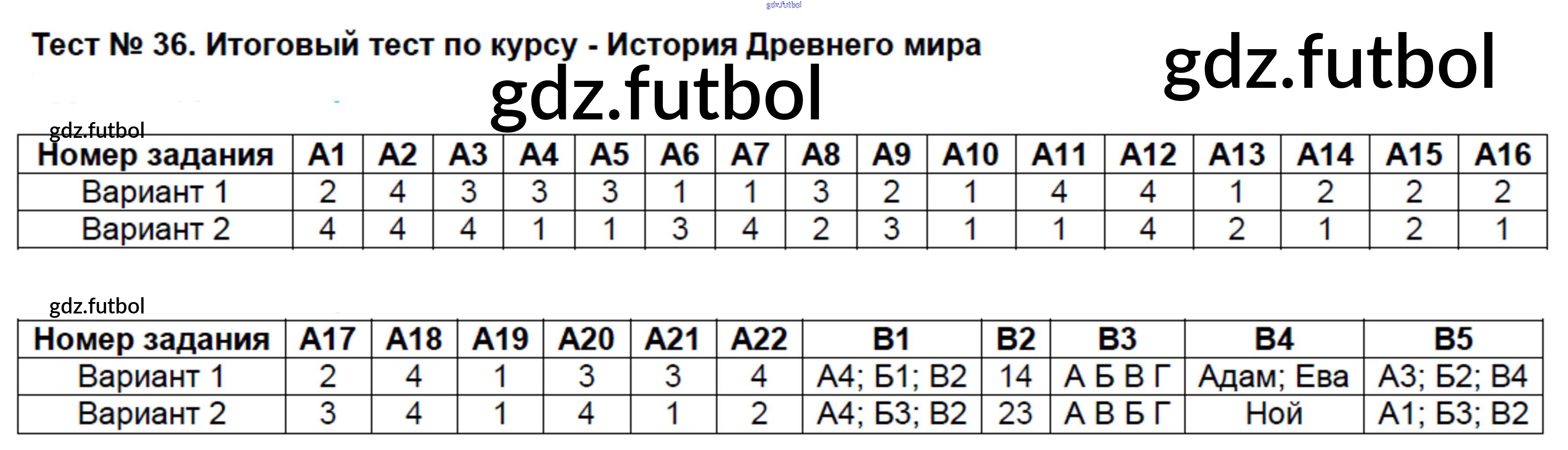 Готовые домашние задания по Истории за 5 класс Волкова Контрольно-измерительные материалы (КИМ) 2017 ФГОС - Тесты Тест №36. Итоговый тест по курсу - История Древнего мира