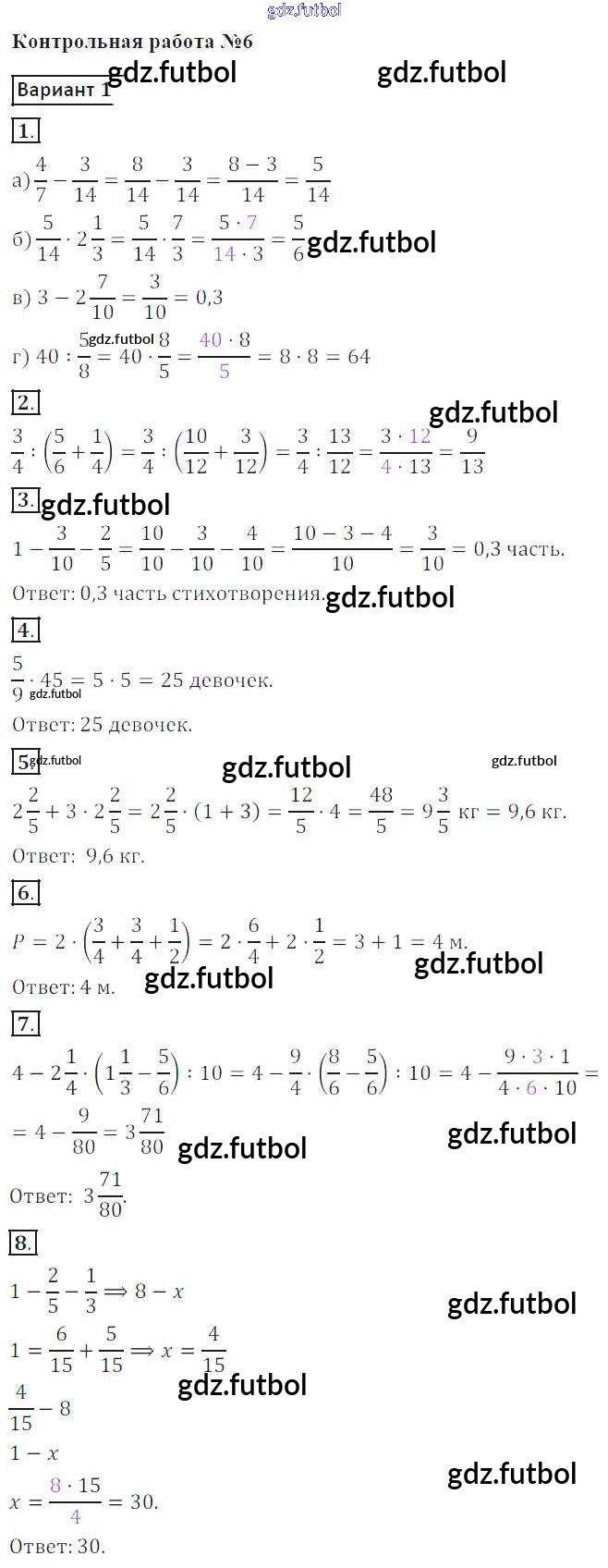 Готовые домашние задания по Математике за 5 класс Кузнецова Контрольные работы 2018 ФГОС - КР №6. Действия с дробями Вариант 1