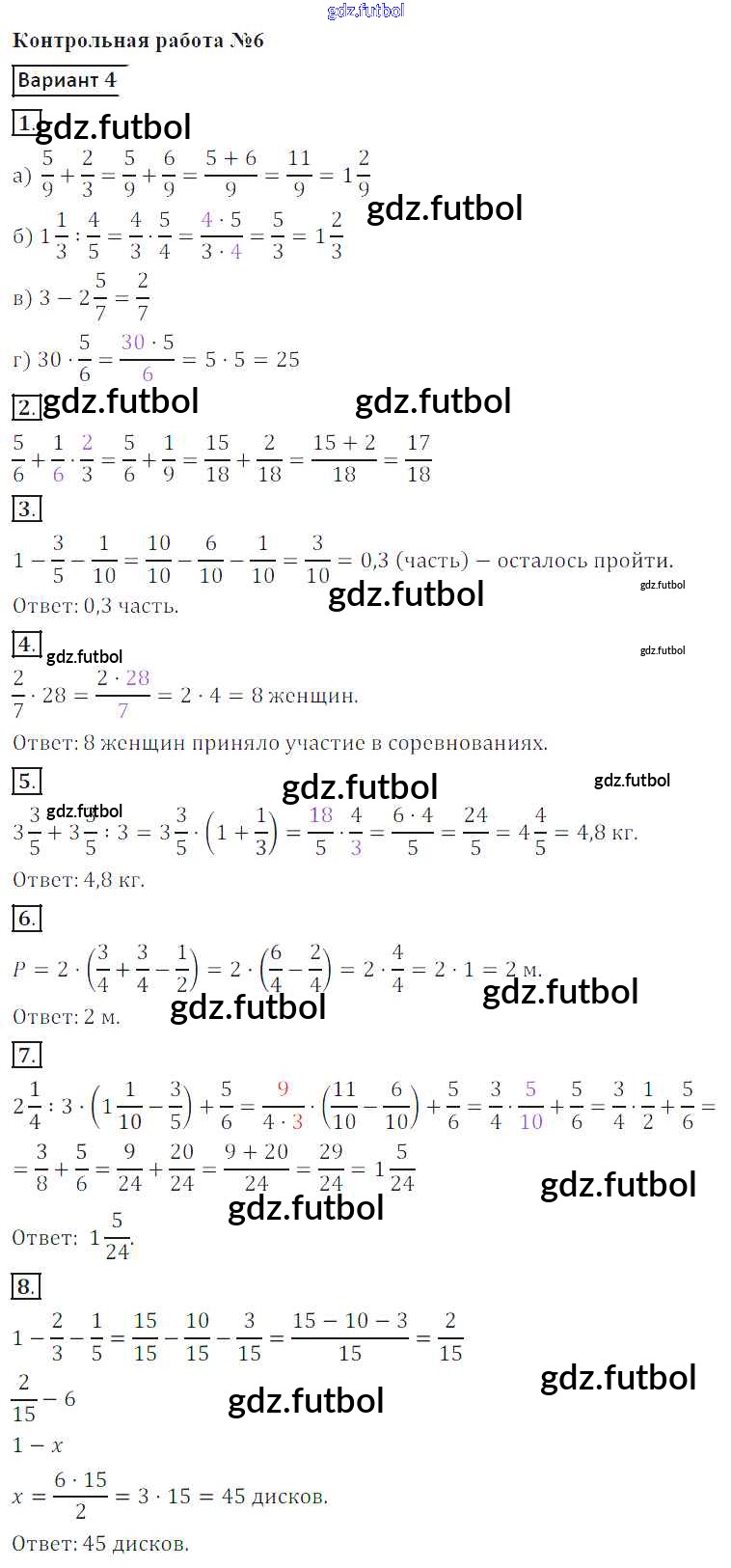 Готовые домашние задания по Математике за 5 класс Кузнецова Контрольные работы 2018 ФГОС - КР №6. Действия с дробями Вариант 4