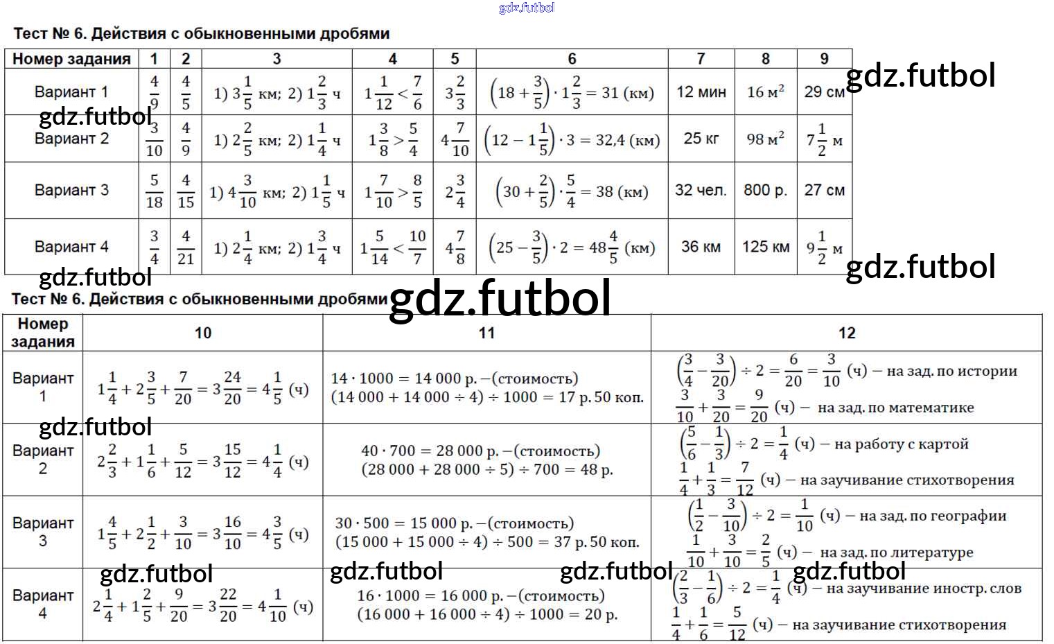 Готовые решения задач (ГДЗ) по Математике пятый класс Минаева Тесты УМК 2016 ФГОС - Тесты Тест №6. Действия с обыкновенными дробями доступны для различных учебных материалов. У нас вы сможете найти авторские решения для всех пособий, предназначенных для школьников. Не секрет, что в настоящее время многие школьники прибегают к использованию готовых решебников, ведь они содержат подробные ответы для каждого упражнения, представленного в учебнике.