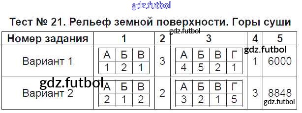 Готовые домашние задания по Географии за 6 класс Пятунина Тесты УМК 2017 ФГОС - Тесты Тест-21. Рельеф земной поверхности. Горы суши