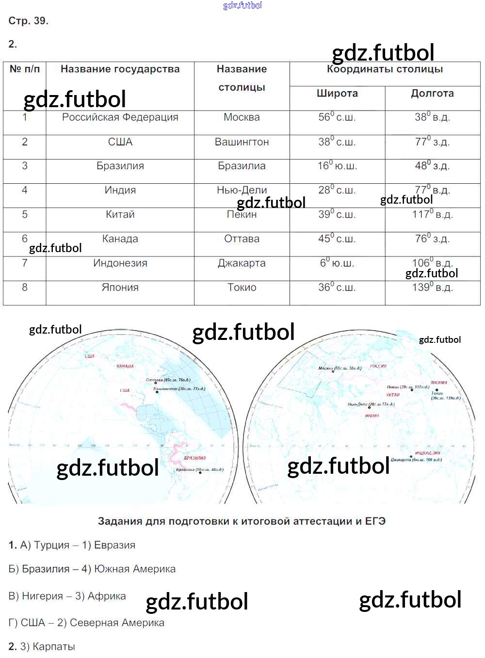 Готовые решения задач (ГДЗ) по Географии пятый-шестой класс Сиротин Рабочая тетрадь 2019 ФГОС - Страницы 39 доступны для различных учебных материалов. У нас вы сможете найти авторские решения для всех пособий, предназначенных для школьников. Не секрет, что в настоящее время многие школьники прибегают к использованию готовых решебников, ведь они содержат подробные ответы для каждого упражнения, представленного в учебнике.