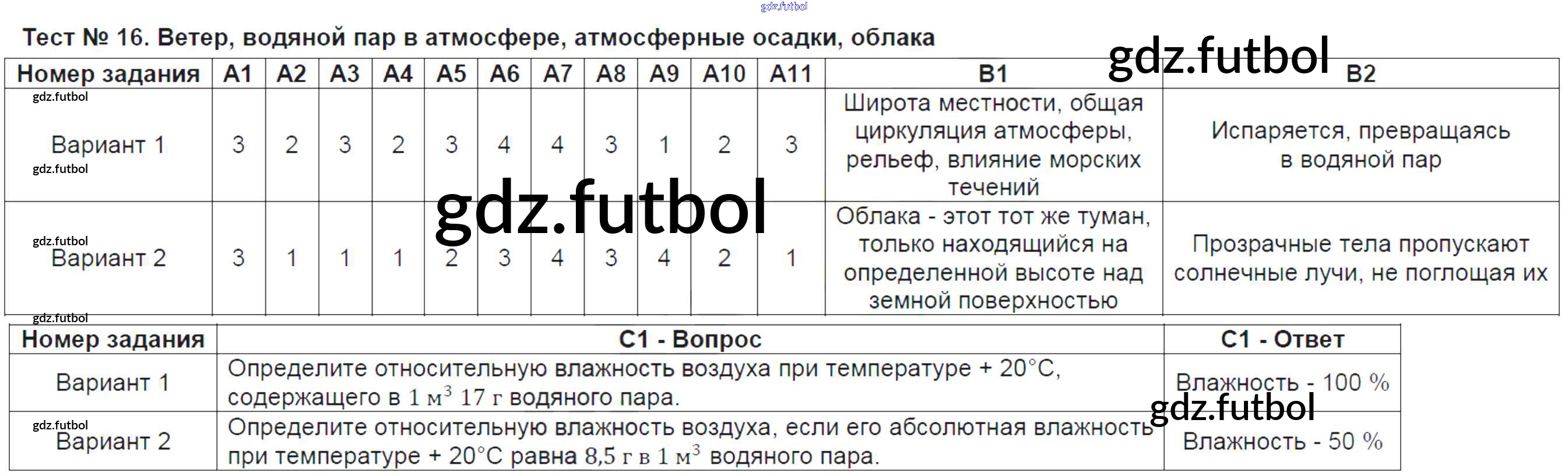 Готовые домашние задания по Географии за 6 класс Жижина Контрольно-измерительные материалы (КИМ) 2018 ФГОС - Тесты Тест-16. Ветер, водяной пар в атмосфере, атмосферные осадки, облака