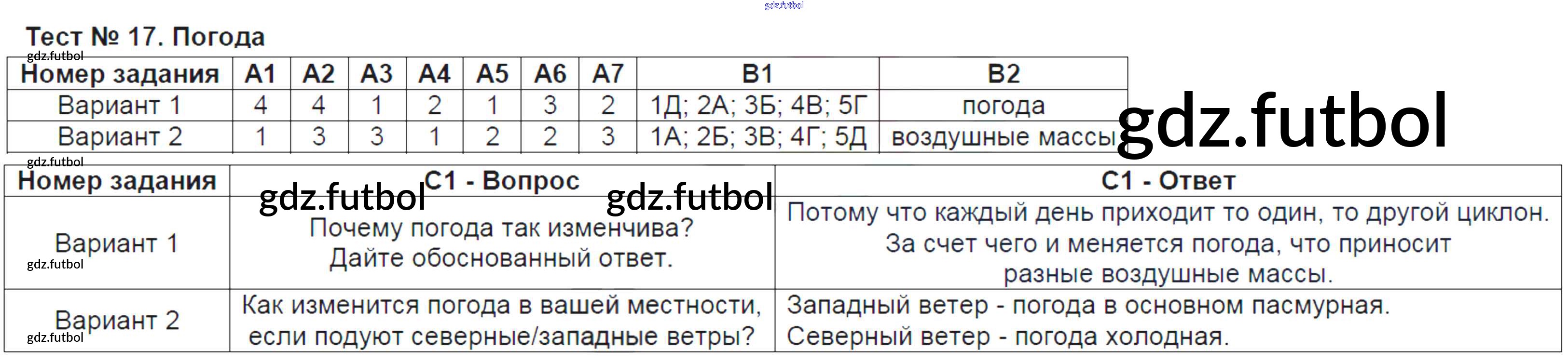 Готовые домашние задания по Географии за 6 класс Жижина Контрольно-измерительные материалы (КИМ) 2018 ФГОС - Тесты Тест-17. Погода