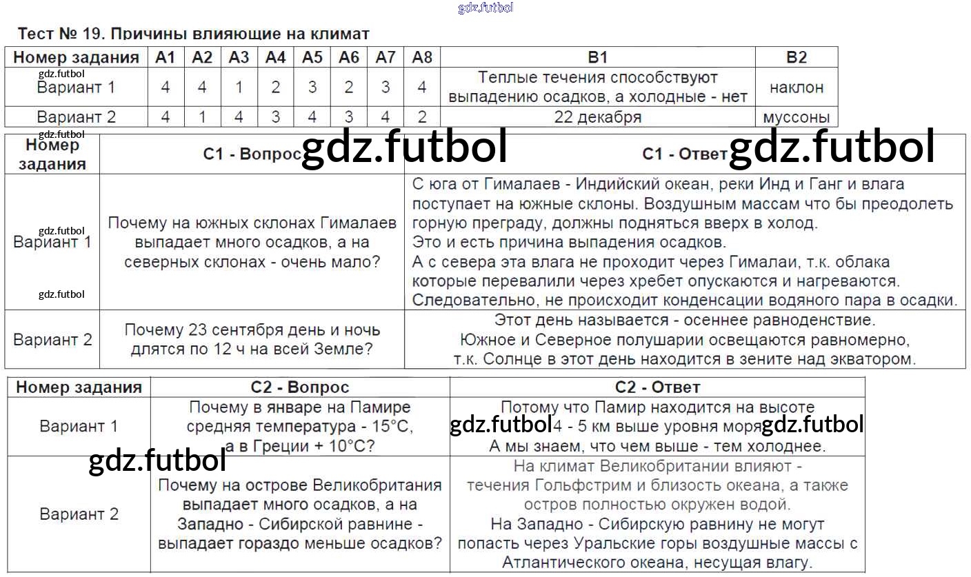 Готовые домашние задания по Географии за 6 класс Жижина Контрольно-измерительные материалы (КИМ) 2018 ФГОС - Тесты Тест-19. Причины влияющие на климат