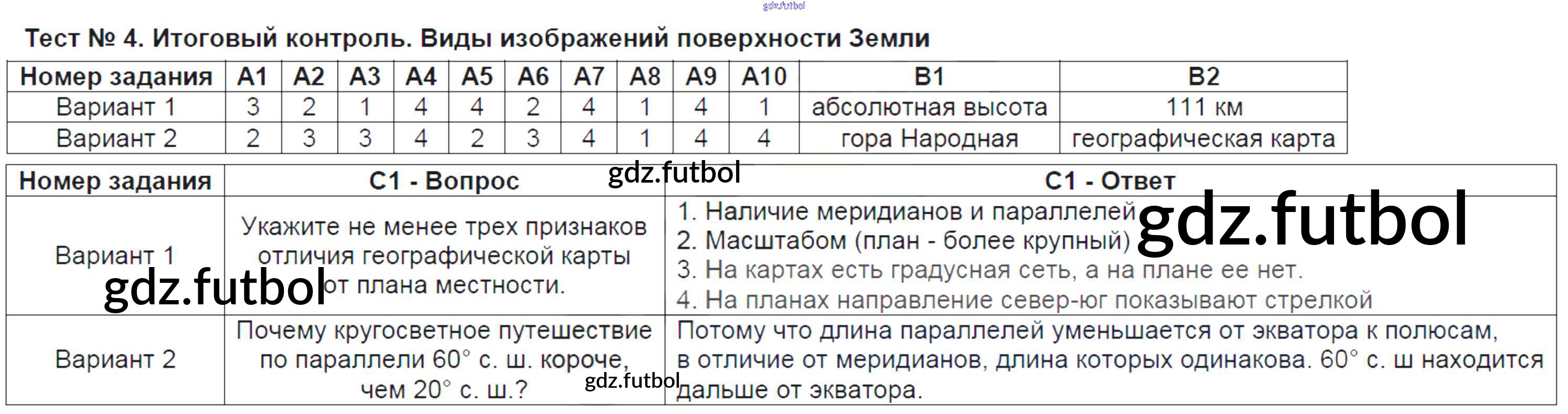 Готовые домашние задания по Географии за 6 класс Жижина Контрольно-измерительные материалы (КИМ) 2018 ФГОС - Тесты Тест-4. Итоговый контроль. Виды изображений поверхности Земли