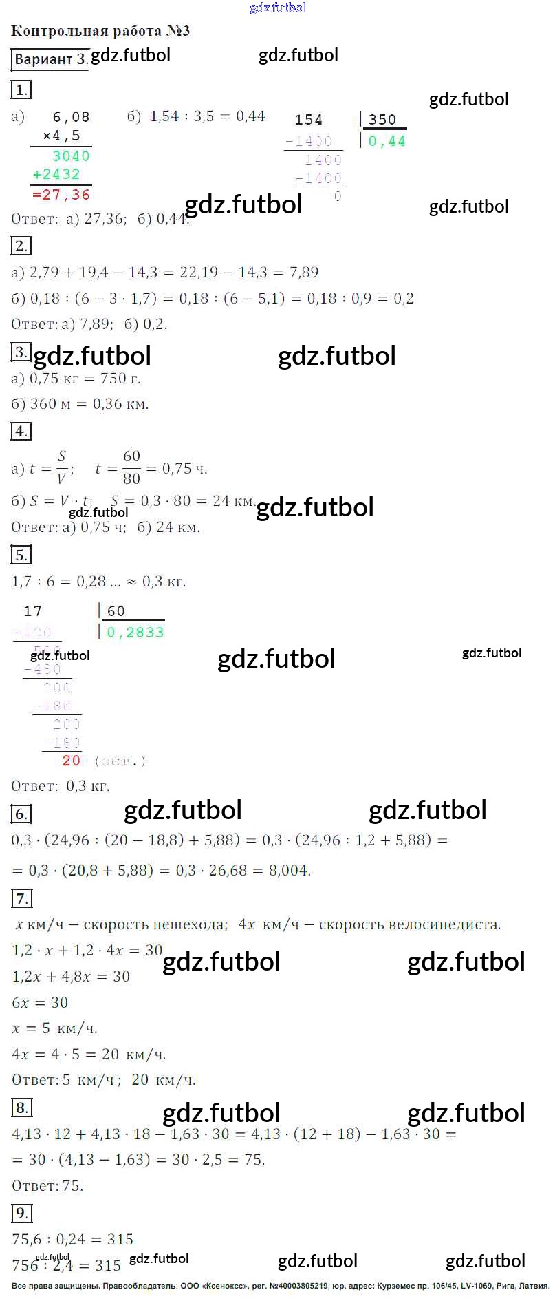 Готовые домашние задания по Математике за 6 класс Кузнецова Контрольные работы 2017 ФГОС - КР-3. Варианты 3