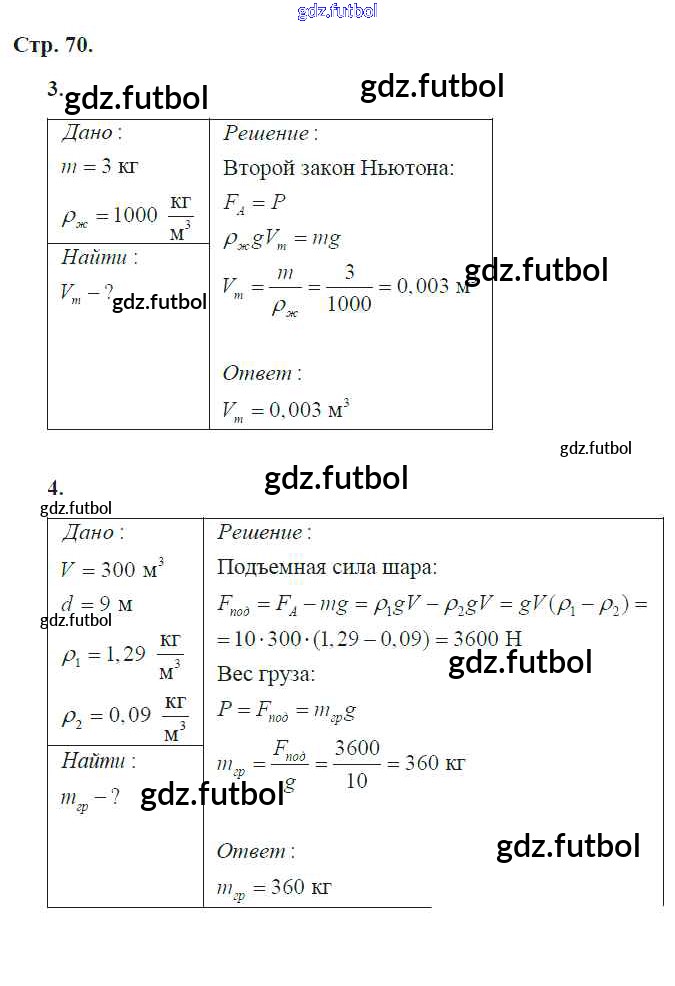 Готовые домашние задания по Физике за 7 класс Артеменков Тетрадь-тренажер Сферы 2016 ФГОС - Глава 7. Закон Архимеда. Плавание тел стр.70