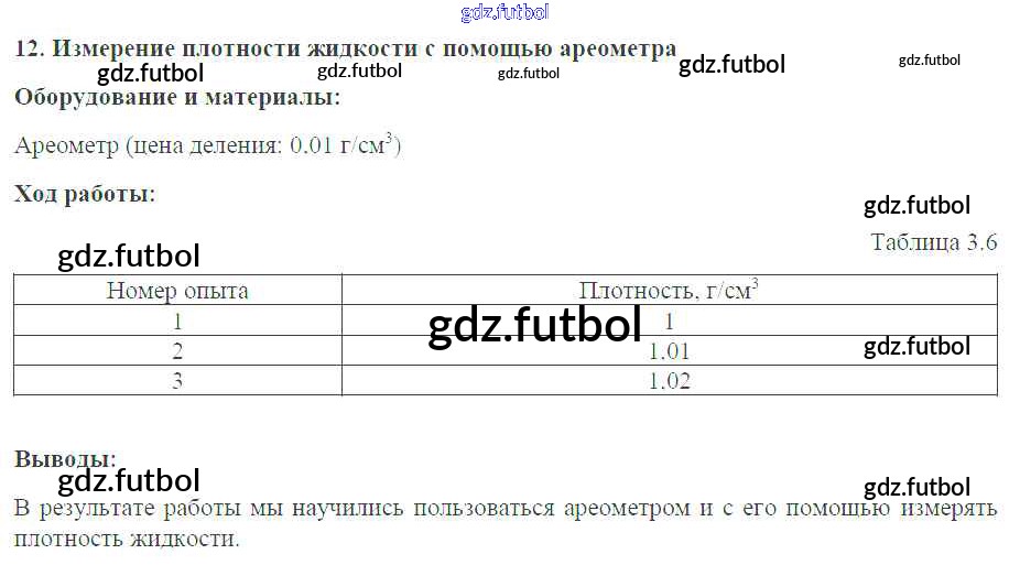 Готовые домашние задания по Физике за 7 класс Белага Тетрадь-практикум Сферы 2012 ФГОС - Лабораторные работы №12. Измерение плотности жидкости с помощью ареометра