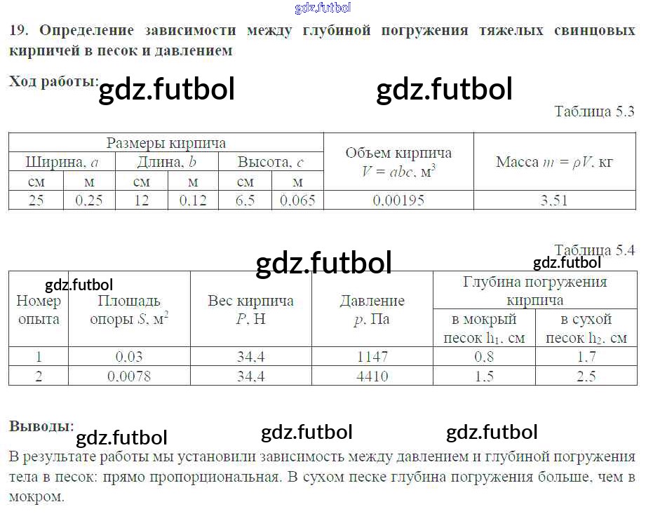 Готовые домашние задания по Физике за 7 класс Белага Тетрадь-практикум Сферы 2012 ФГОС - Лабораторные работы №19. Определение зависимости между глубиной погружения тяжелых свинцовых кирпичей в песок и давлением