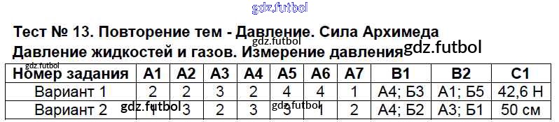 Готовые домашние задания по Физике за 7 класс Бобошина Контрольно-измерительные материалы (КИМ) 2014 ФГОС - Тесты Тест №13. Повторение тем - Давление. Сила Архимеда и др.