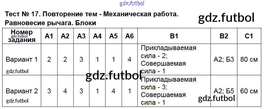 Готовые домашние задания по Физике за 7 класс Бобошина Контрольно-измерительные материалы (КИМ) 2014 ФГОС - Тесты Тест №17. Повторение тем - Механическая работа. Равновесие рычага. Блоки