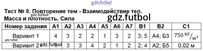 Готовые домашние задания по Физике за 7 класс Бобошина Контрольно-измерительные материалы (КИМ) 2014 ФГОС - Тесты Тест №8. Повторение тем - Взаимодействие тел. Масса и плотность. Сила