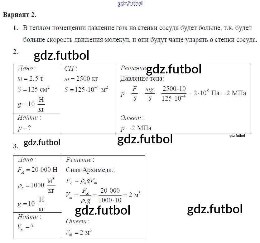 Готовые домашние задания по Физике за 7 класс Марон Самостоятельные и контрольные работы Вертикаль 2016 ФГОС - КР №-3. Давление твердых тел, жидкостей и газов Вариант №2