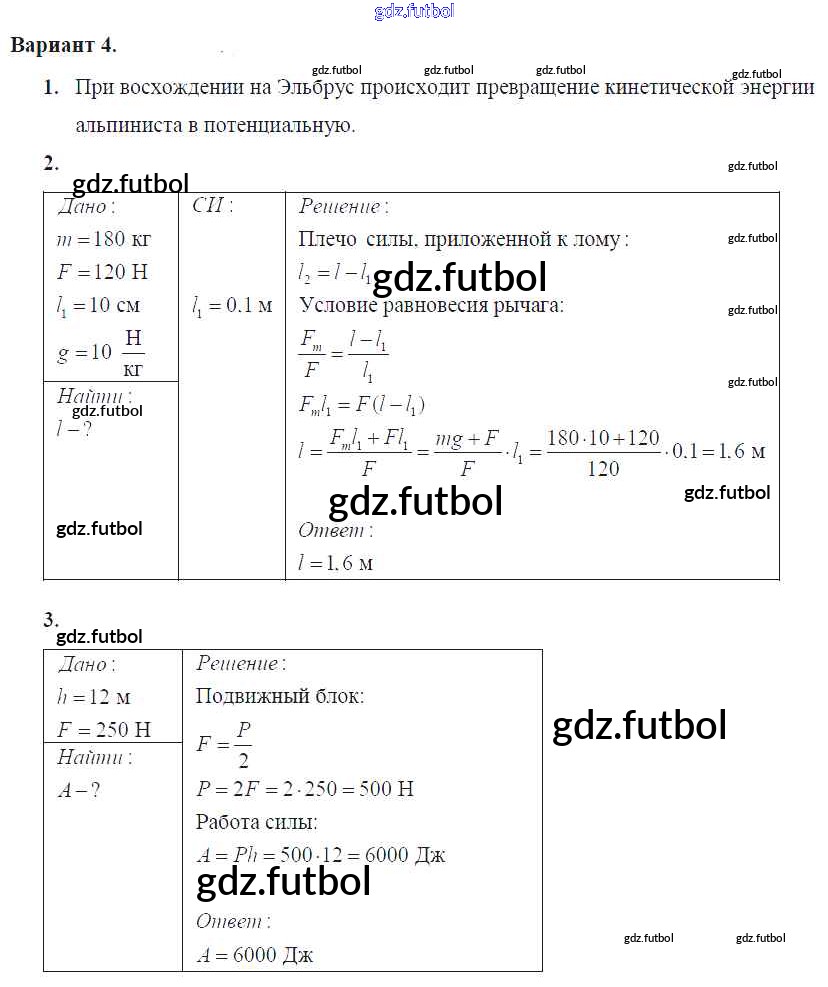 Готовые домашние задания по Физике за 7 класс Марон Самостоятельные и контрольные работы Вертикаль 2016 ФГОС - КР №-4. Работа и мощность. Энергия Вариант №4