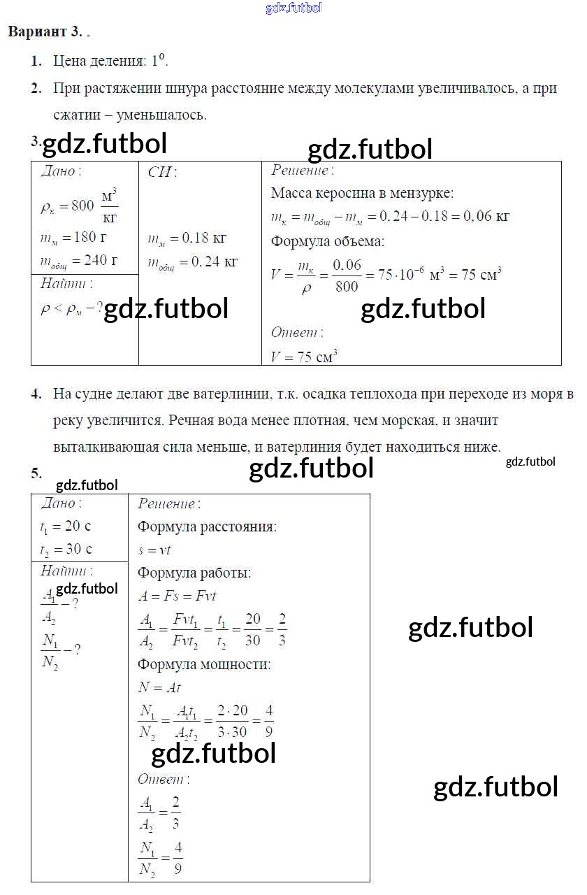 Готовые домашние задания по Физике за 7 класс Марон Самостоятельные и контрольные работы Вертикаль 2016 ФГОС - КР №-5. Итоговая Вариант №3