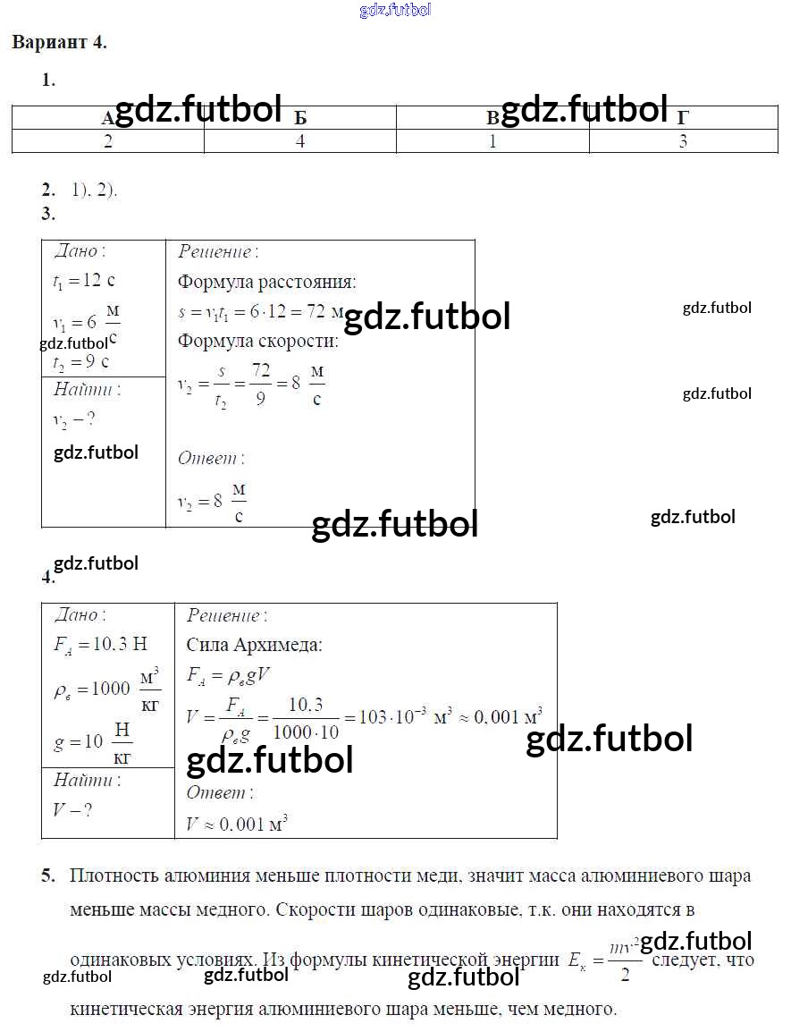 Готовые домашние задания по Физике за 7 класс Марон Самостоятельные и контрольные работы Вертикаль 2016 ФГОС - КР №-5. Итоговая Вариант №4