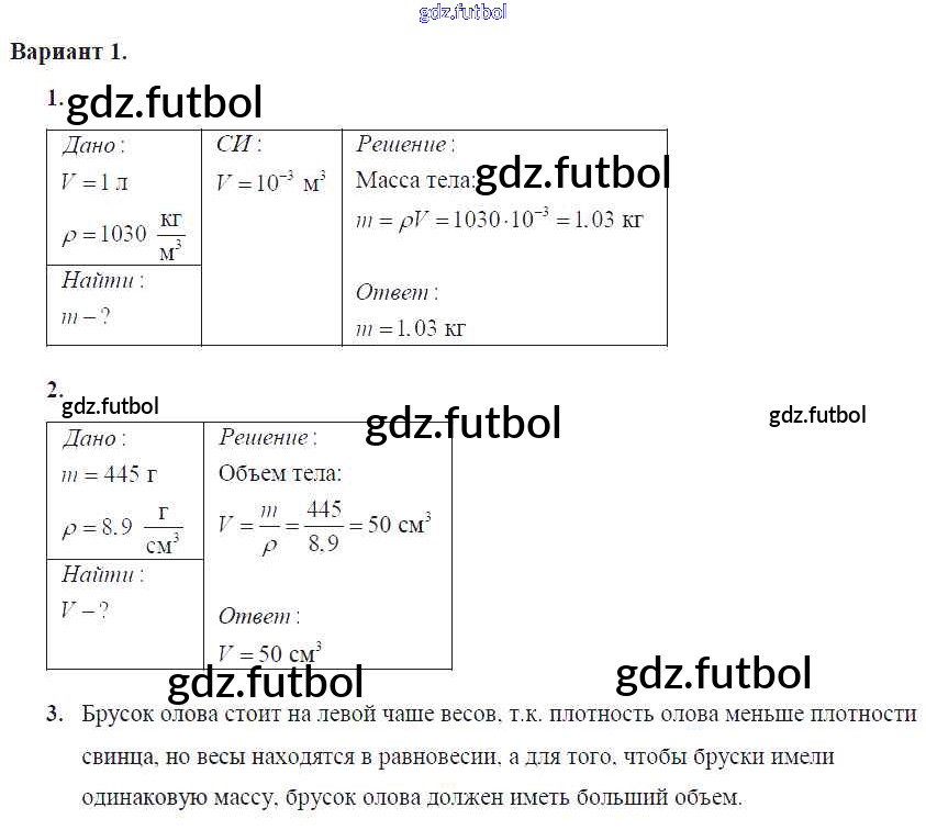 Готовые домашние задания по Физике за 7 класс Марон Самостоятельные и контрольные работы Вертикаль 2016 ФГОС - СР-№23. Расчет массы и объема тела по его плотности Вариант №1