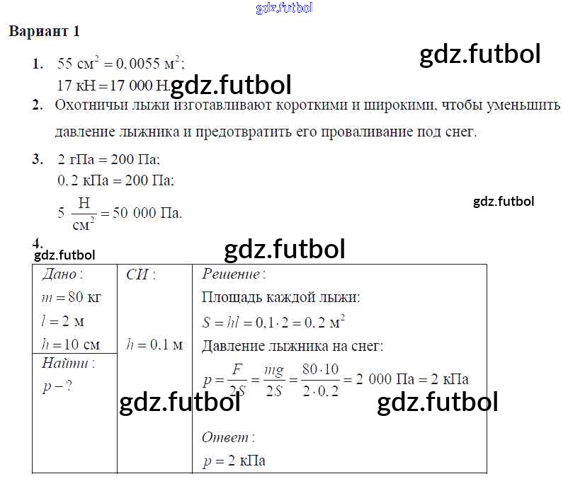 Готовые домашние задания по Физике за 7 класс Марон Самостоятельные и контрольные работы Вертикаль 2016 ФГОС - СР-№35. Давление. Единицы давления Вариант №1