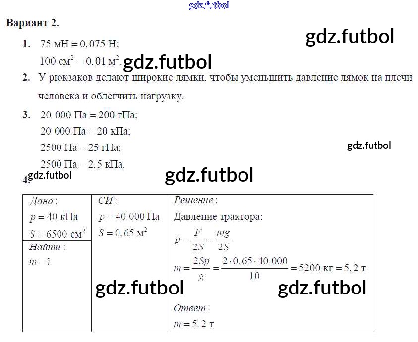 Готовые домашние задания по Физике за 7 класс Марон Самостоятельные и контрольные работы Вертикаль 2016 ФГОС - СР-№35. Давление. Единицы давления Вариант №2