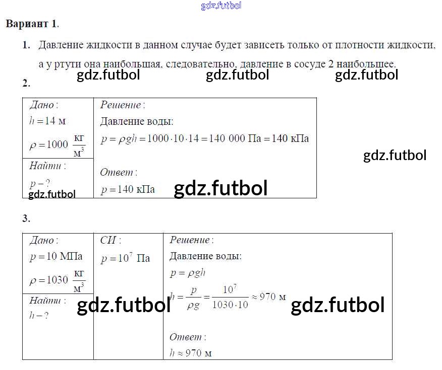 Готовые домашние задания по Физике за 7 класс Марон Самостоятельные и контрольные работы Вертикаль 2016 ФГОС - СР-№40. Расчет давления жидкости на дно и стенки сосуда Вариант №1