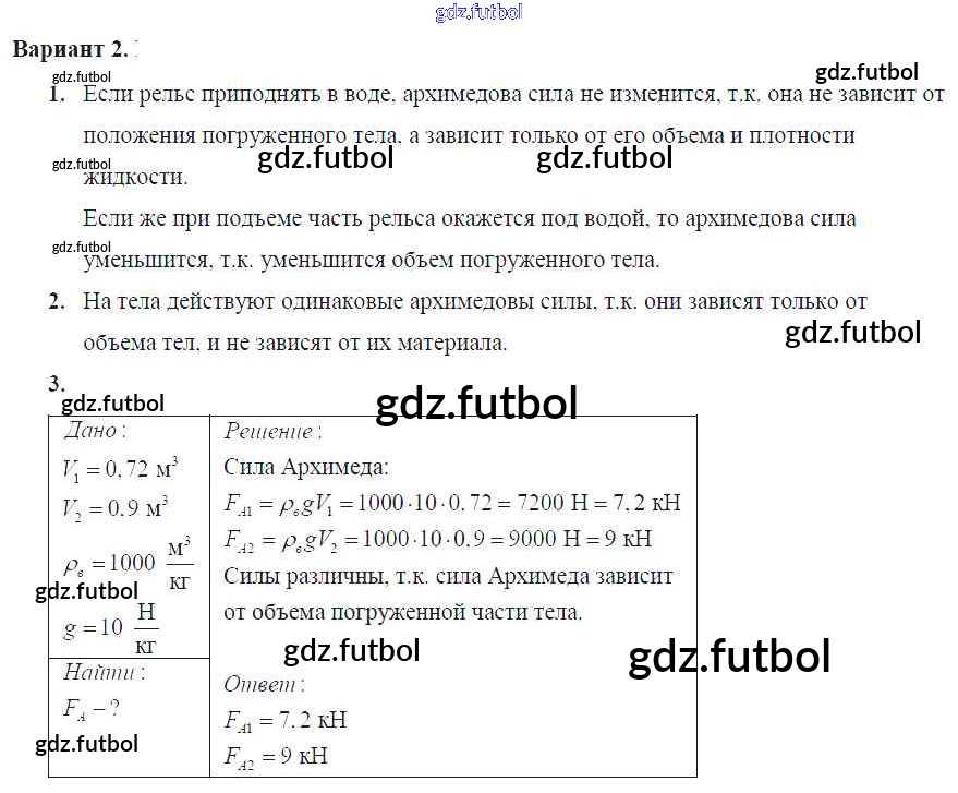 Готовые домашние задания по Физике за 7 класс Марон Самостоятельные и контрольные работы Вертикаль 2016 ФГОС - СР-№51. Архимедова сила Вариант №2