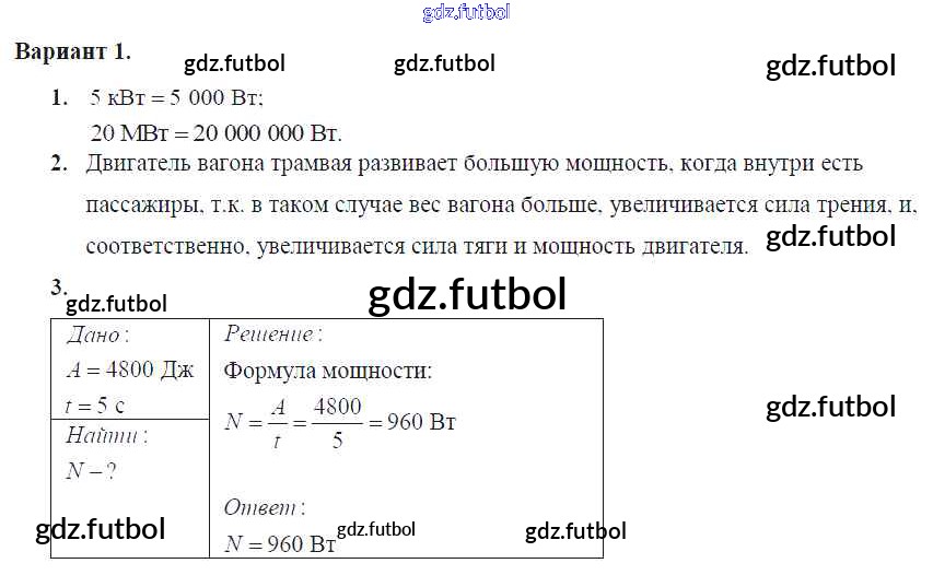 Готовые домашние задания по Физике за 7 класс Марон Самостоятельные и контрольные работы Вертикаль 2016 ФГОС - СР-№56. Мощность. Единицы мощности Вариант №1