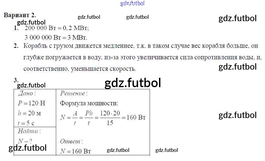 Готовые домашние задания по Физике за 7 класс Марон Самостоятельные и контрольные работы Вертикаль 2016 ФГОС - СР-№56. Мощность. Единицы мощности Вариант №2