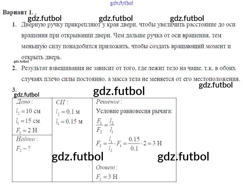 Готовые домашние задания по Физике за 7 класс Марон Самостоятельные и контрольные работы Вертикаль 2016 ФГОС - СР-№58. Рычаги. Равновесие сил на рычаге Вариант №1