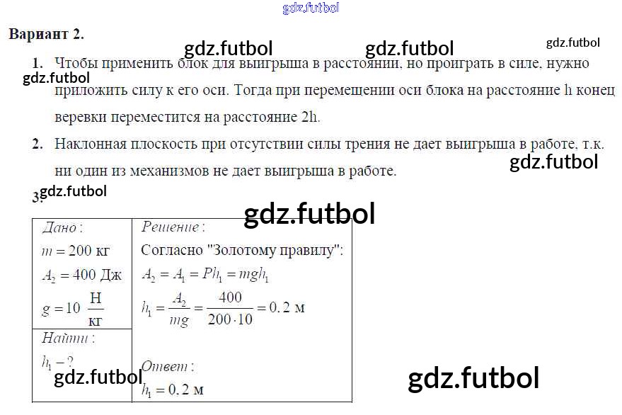 Готовые домашние задания по Физике за 7 класс Марон Самостоятельные и контрольные работы Вертикаль 2016 ФГОС - СР-№62. Равенство работ при использовании простых механизмов Вариант №2
