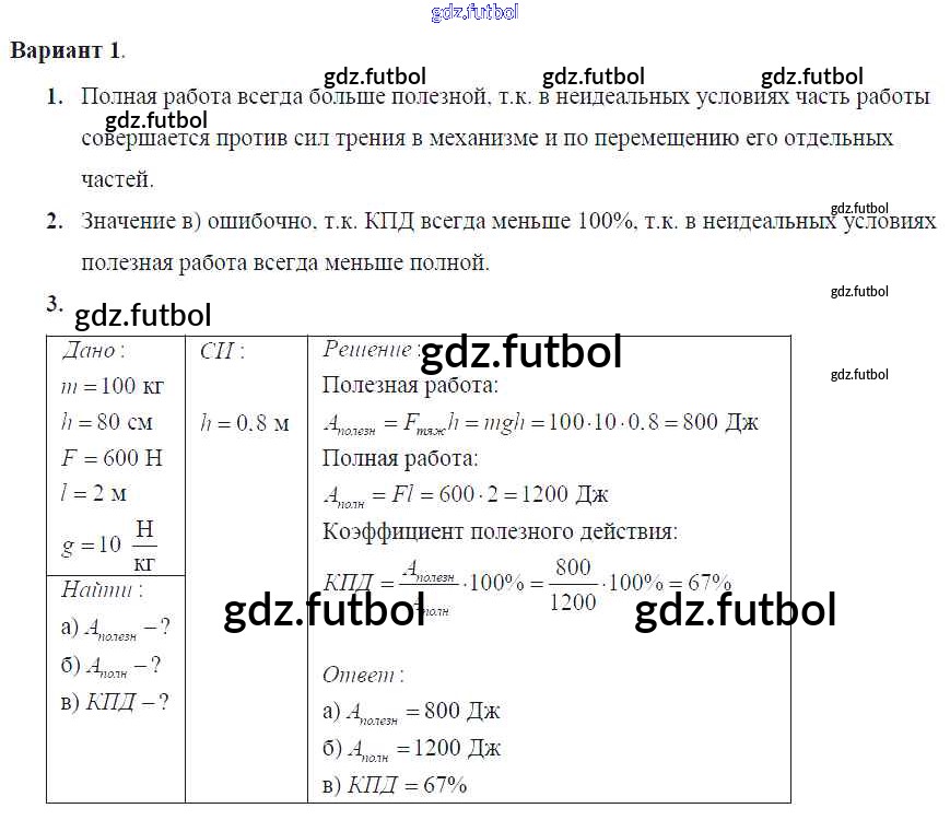 Готовые домашние задания по Физике за 7 класс Марон Самостоятельные и контрольные работы Вертикаль 2016 ФГОС - СР-№65. Коэффициент полезного действия механизма Вариант №1